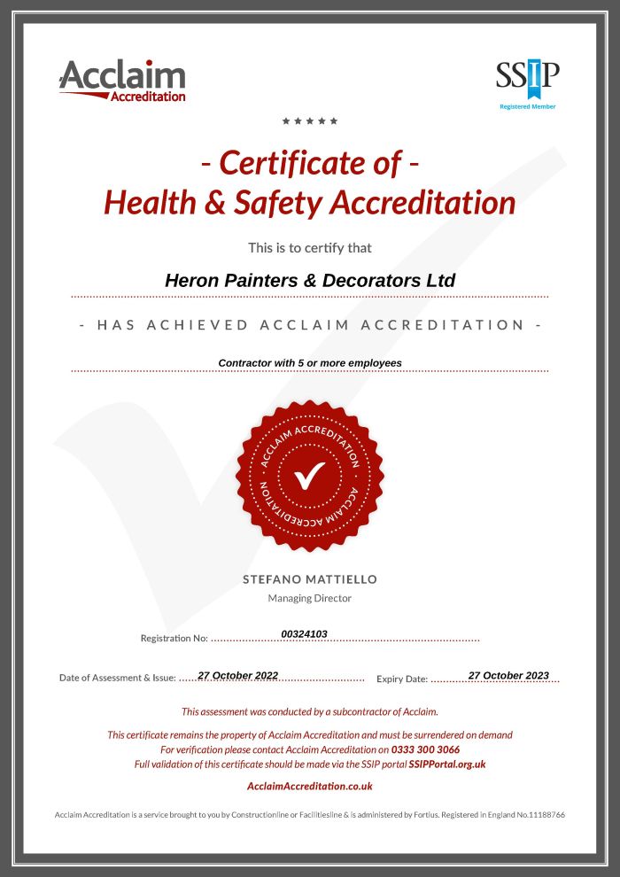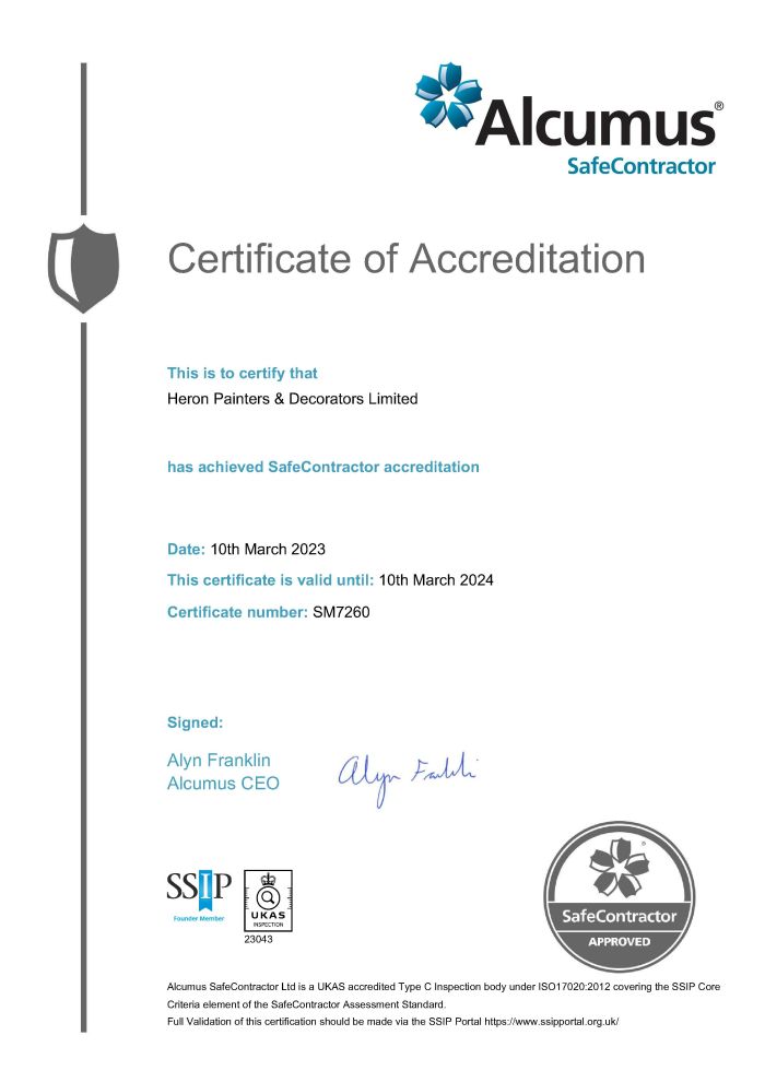 Heron are pleased to announce our CHAS accreditation. The Contractors Health and Safety Assessment Scheme was created in 1997 to improve Health & Safety standards across the UK. In partnership with the Association of London Government (ALG), CHAS was a key developer of the core criteria held in the Approved Code of Practice which supported the Construction (Design and Management) Regulations 2007. (Now recognised as CDM 2015) and is a founder member of SSIP (Safety Schemes in Procurement). Yolanda Noye, Director said “Heron are always happy to obtain the necessary accreditations or certifications required by our clients”