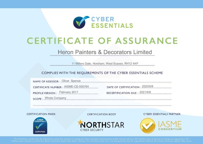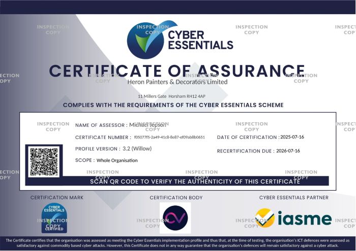We're pleased to share that Heron Painters & Decorators Ltd has once again successfully passed its Cyber Essentials accreditation for another year. This government-backed certification demonstrates our ongoing commitment to cyber security, helping to protect our business, clients, and partners from online threats. Staying secure and resilient remains a top priority as we continue to deliver high-quality services.