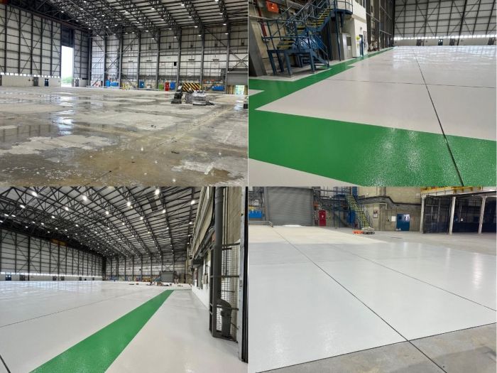 Our project culminated in the aircraft hangar with the meticulous refurbishment of the floor area. The original surface was carefully abraded in preparation for the application of a new epoxy paint system, and the demarcation lines were precisely reinstated.