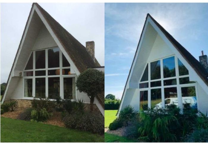 It is not often that we undertake residential work but Heron were approached by a delightful customer who owed a unique property with challenging access requirements.  We were more than happy to complete the external decorations and used several different types of access equipment from our own fleet to reach the more difficult areas around the property.  The above picture is a before and after shot of the front elevation.