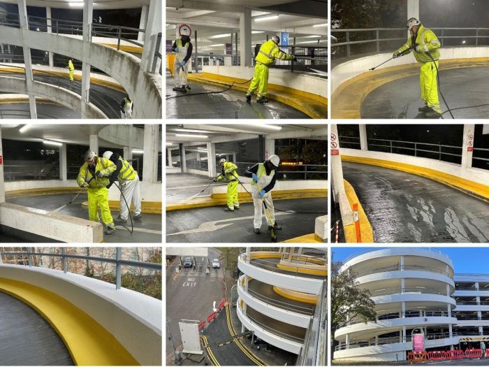 At the South Terminal Multi Storey Car Parks, washing down the ramps was a crucial first step to remove dirt, grime and contaminants, ensuring the surfaces were clean and ready for the application of fresh paint.  This not only improves the adhesion and durability of the finish but guarantees a high-quality, long-lasting result, ready to meet the rigorous demands of a busy environment.